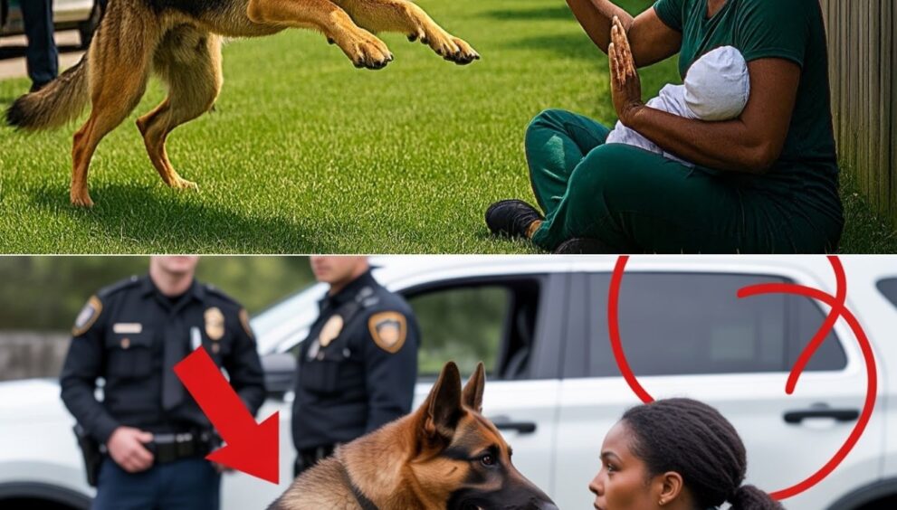 The officers’ faces were grim, their body language radiating a hostility that seemed entirely out of place. Before she could even process their sudden appearance, a K9 unit was unleashed. It was a magnificent, intimidating animal, its muscles coiled like a spring, its teeth bared in a low growl. The dog’s eyes, trained and focused, locked onto her, seeing not a mother and child, but a target. In that moment, the world seemed to narrow to the space between them—a woman, her baby, and a creature bred for aggression.