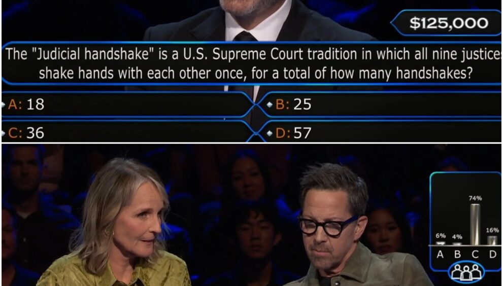 “The ‘Judicial handshake’ is a U.S. Supreme Court tradition in which all nine justices shake hands with each other, for a total of how many handshakes?” host Jimmy asked.