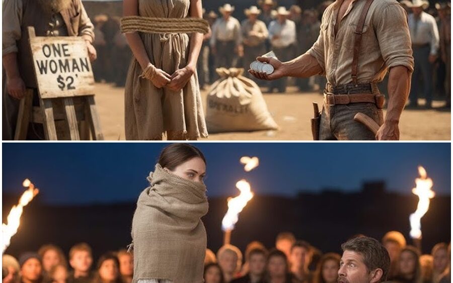 Lonely lumberjack paid $2 for woman with sack on her head at auction marries her when she says name. Oregon territory. Spring of 1869. A dustworn outpost along the Oregon Trail. The scent of dry timber, horse sweat, and tobacco hangs thick in the air. Around the makeshift auction stage, nothing more than planks nailed to wagon crates. A crowd of men gathers.